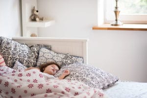 Little girl with smartphone lying in a bed, bedtime