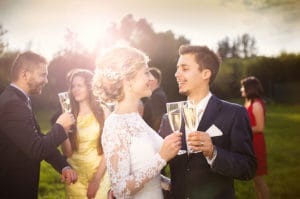 Newlyweds and wedding guests clinking glasses