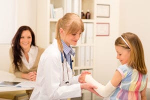 Pediatrician checking bandage girl arm