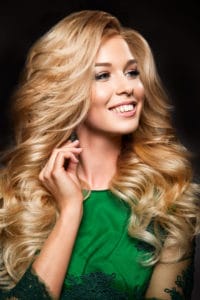 Portrait of elegant sexy blonde woman with long curly hair and glamour makeup.